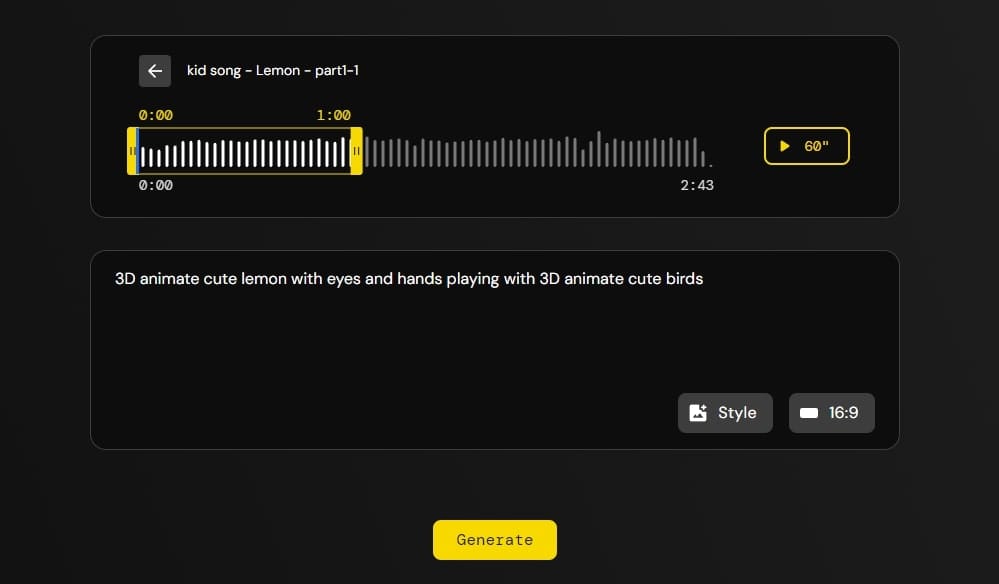 生成兒歌後,利用 Noisee AI 創建 MV。輸入 Suno AI 歌曲連結,點撃「Enter」,把時長拉至 1 分鐘,輸入文字描述,然則點撃「Generate」,亦可生成約 1 分鐘的 MV。