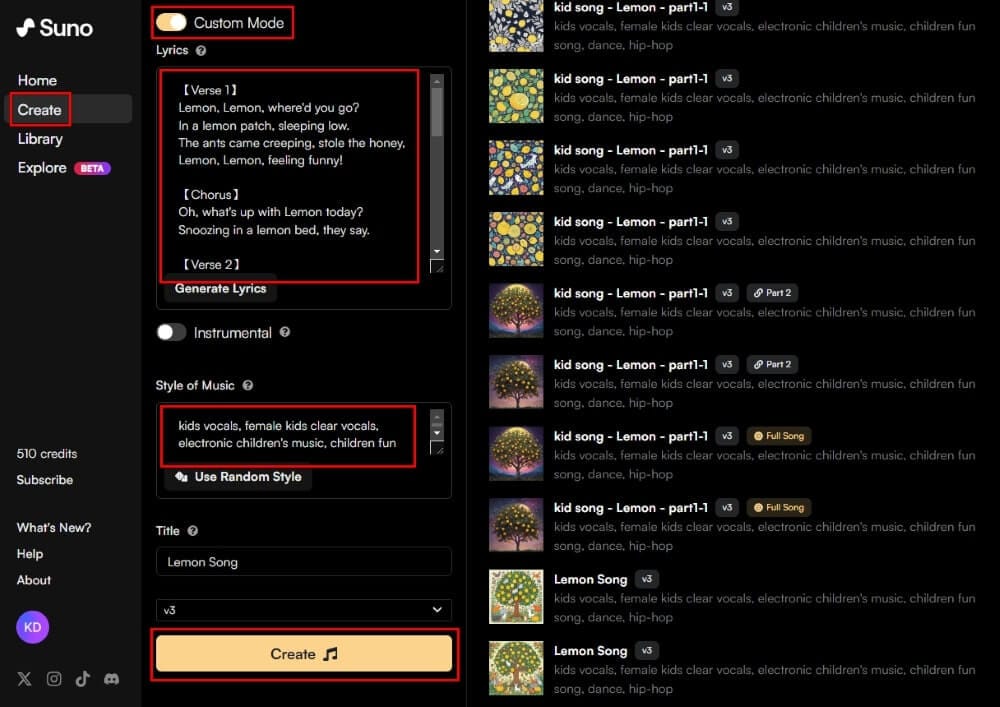 首先,利用 Suno 創作兒歌。在左側點撃「Create」,打開「Custom Mode」,輸入歌詞及風格,點撃「Create」生成音樂。