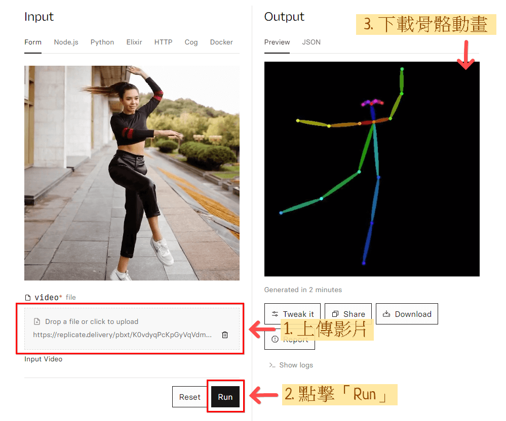 2. 上傳影片,點撃「Run」,右方會生成骨骼動畫,在骨骼動畫下方點撃「Download」即可下載影片。