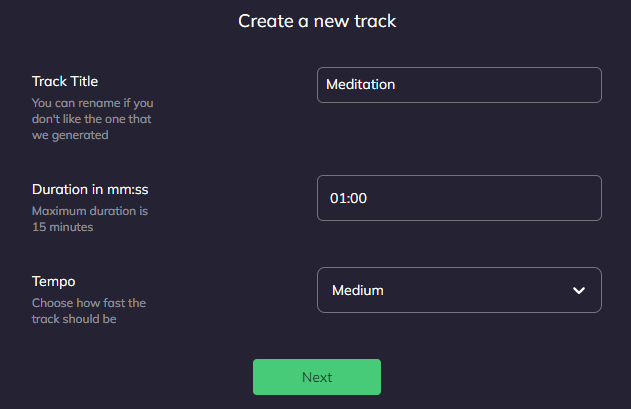 2. 輸入 Track Name,音樂時長及 Tempo。 Tempo 可選擇 “Slow”、”Medium”、”Fast”,決定音樂節奏的快慢。