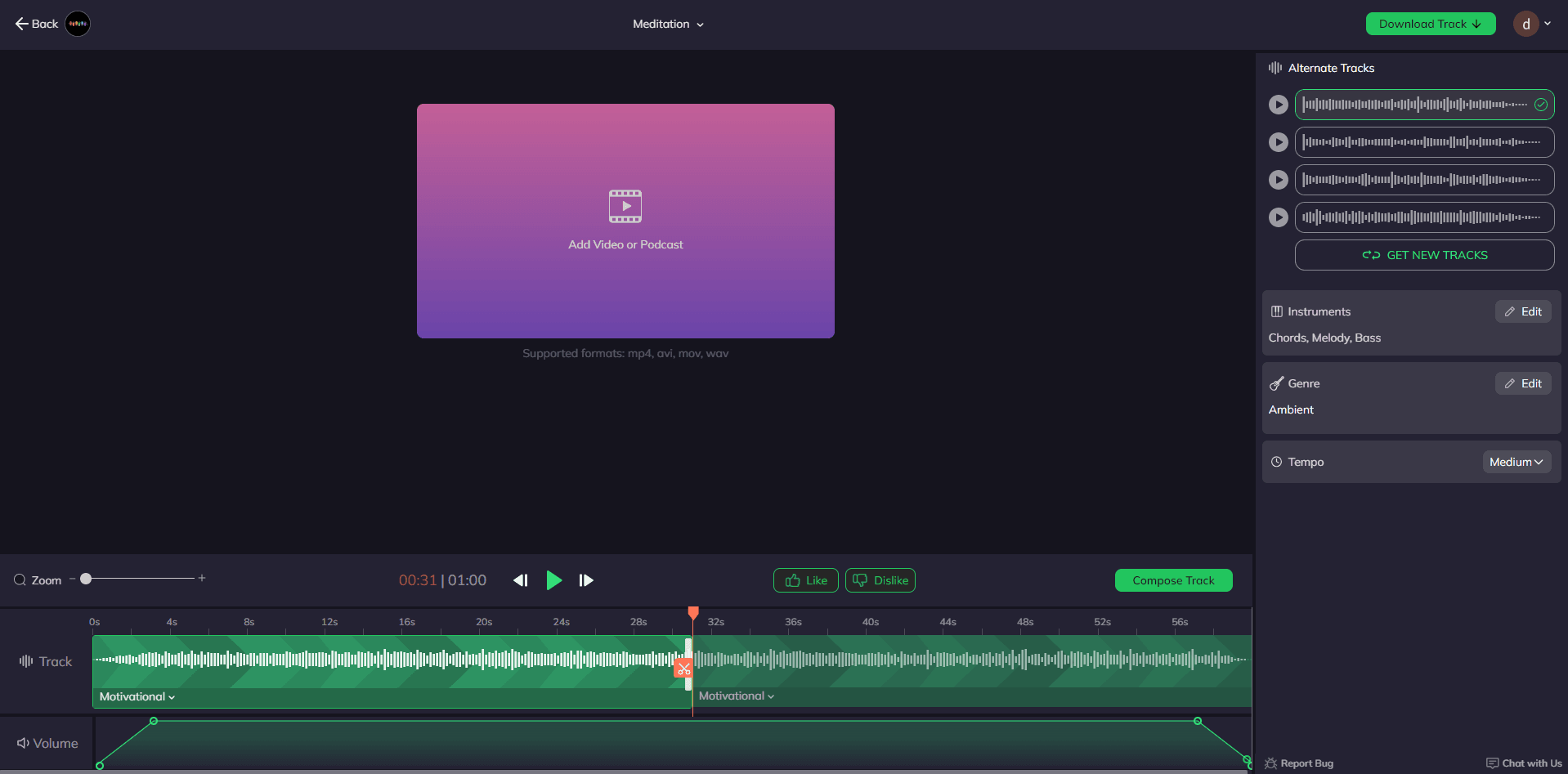 在 Beatoven 編輯器,可以剪輯音樂、調整音量、風格及樂器等。