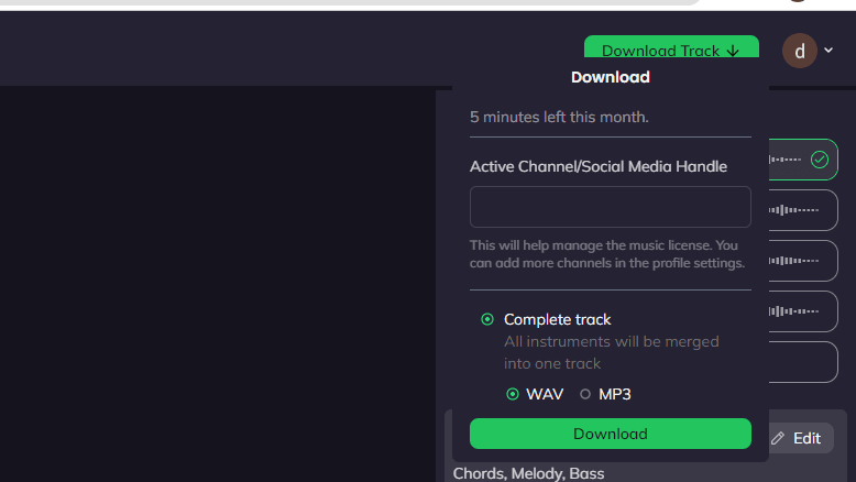點撃右上方 “Download Track”,選擇 WAV 或 MP3 檔案,然後點撃 “Download”。