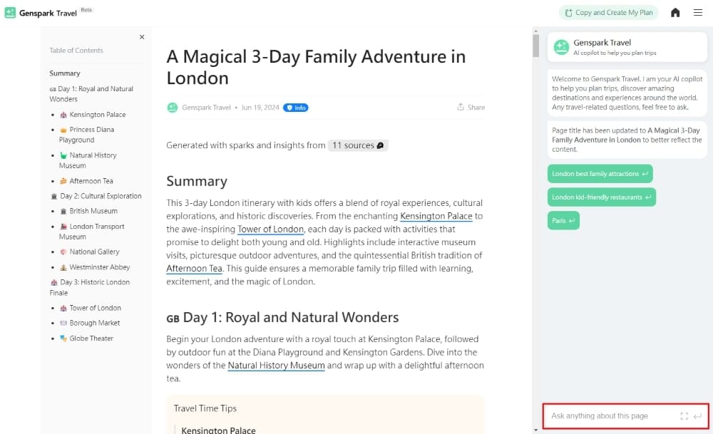用戶可在 Sparkpage 頁面內建的聊天機械人,輸入與 Sparkpage 上的內容相關的後續問題,如價格或更多旅遊景點等。如想保存頁面,右上方點撃「Copy and Create My Plan」。