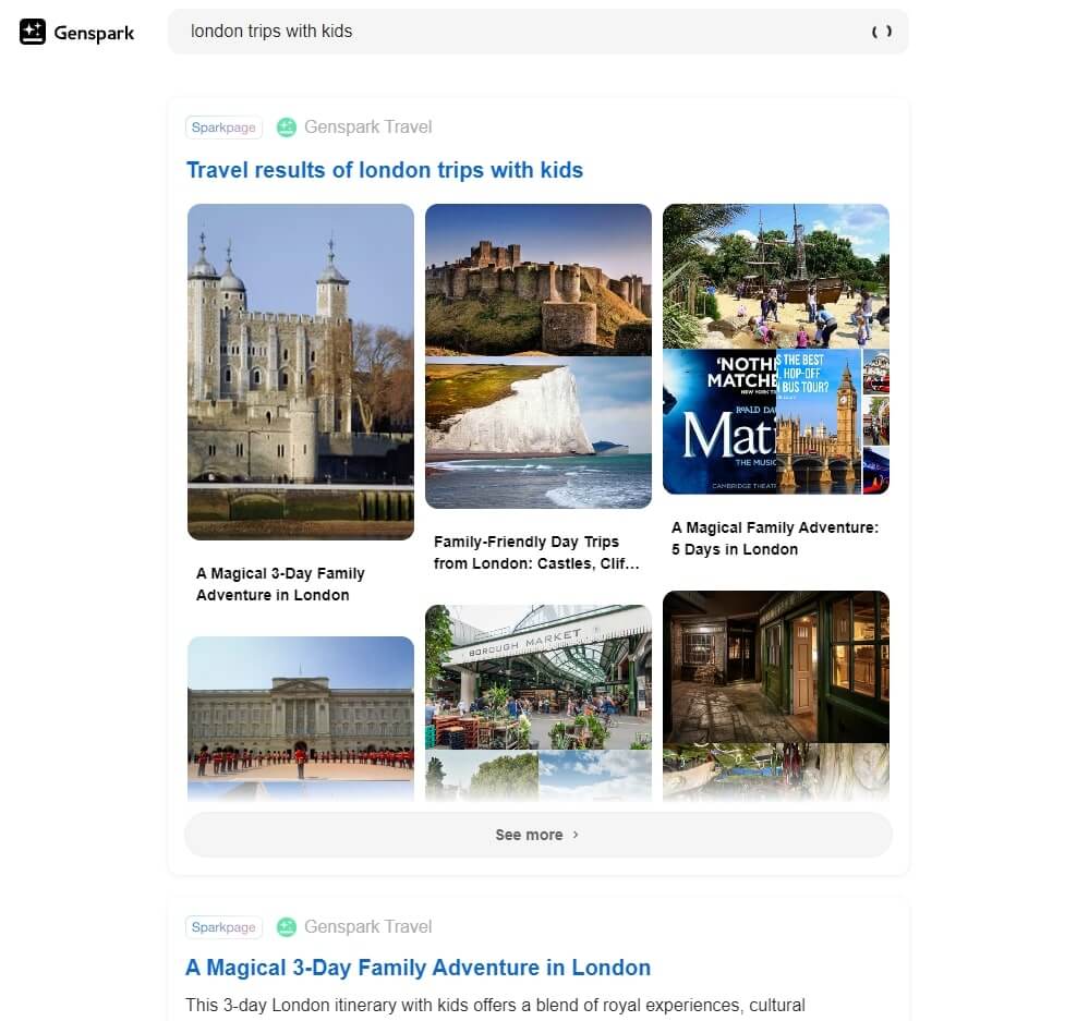 類似傳統搜索引擎,在輸入框輸入文字,查找相關資訊。Genspark 根據用戶查詢,產生新的合成頁面 Sparkpages,整合內容。