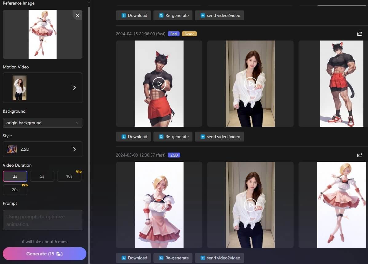 此功能類似 Viggle AI,上傳參考圖片及 Motion 影片,選擇風格和影片時長,有需要亦可以輸入文字描述優化影片動作,完成後點撃「Generate」。