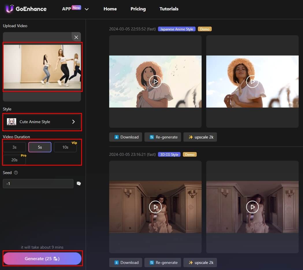 上傳影片,選擇風格和影片時長,然後點撃「Generate」。