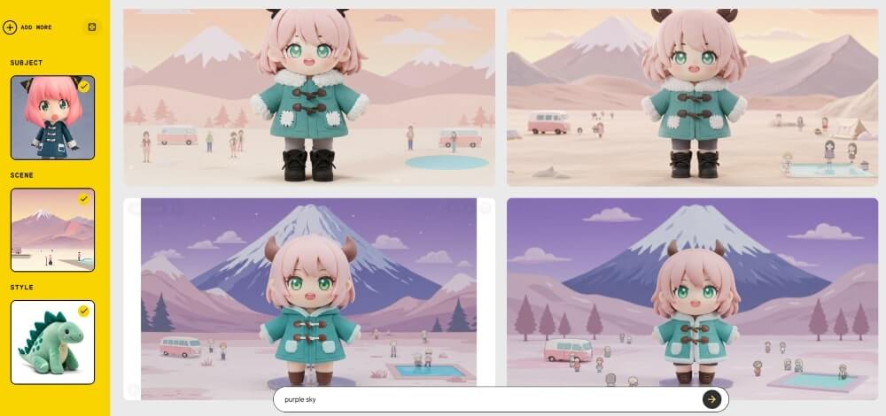 上傳主題、場景和風格圖片或使用提示詞。 Whisk 將根據混合顯示多張圖片,可以透過編輯提示詞來優化生成的圖片。