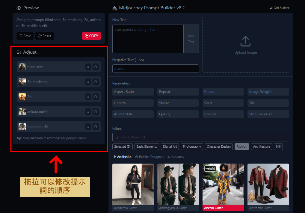 拖拉可以修改提示詞的順序。