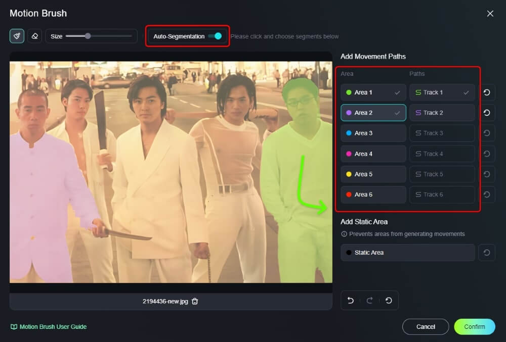 點撃圖片想要移動的人物或物件,在圖片上方打開「Auto-Segmentation」,會更易選中人物或物件。完成後,點撃右方「Track 1」指定想要移動的軌跡及方向。