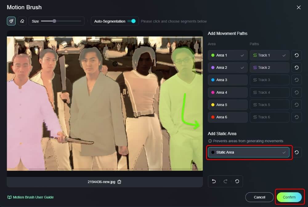 如果想阻止 Kling AI 移動特定位置,點撃「Static Area」,然後,在圖片選擇想要靜態的部份。點撃「Confirm」,完成 Motion Brush 部份。