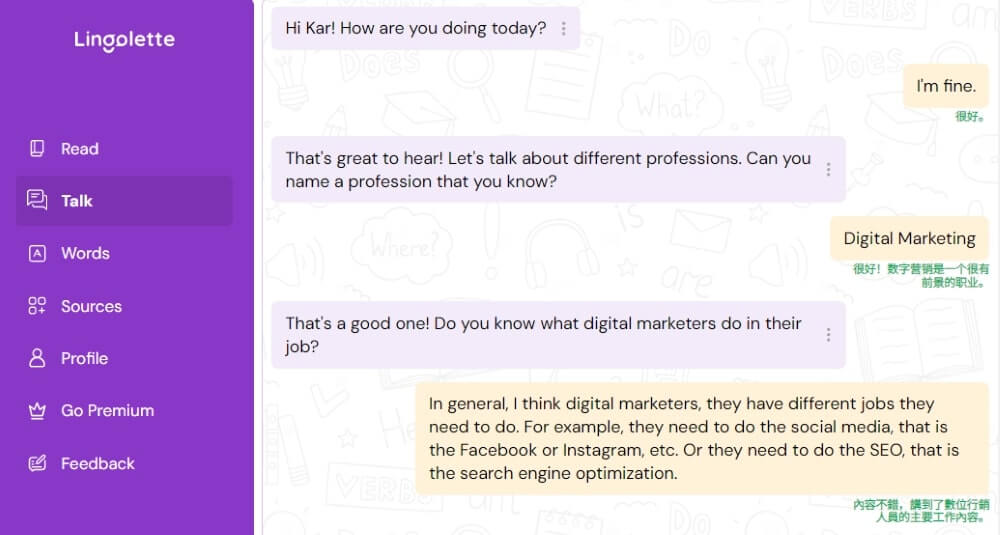 Lingolette AI 提供免費版及付費版,免費版每個聊天最多 20 則回覆及每周三篇文章。