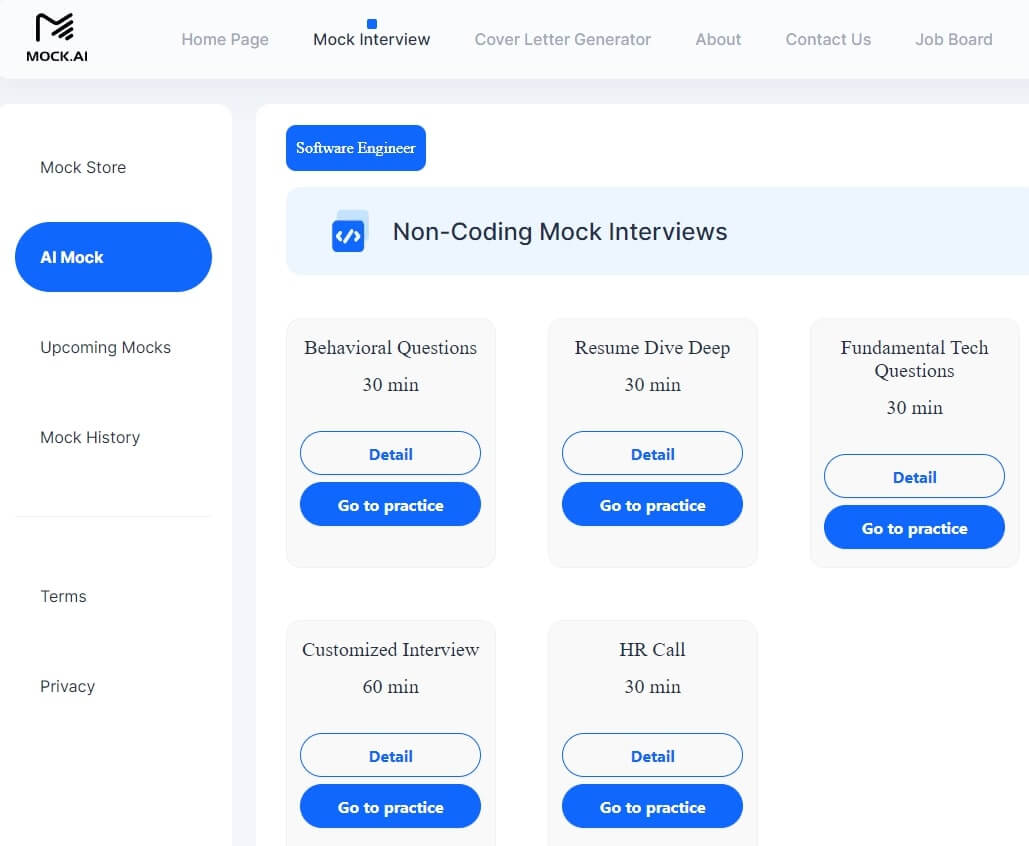 點撃「Mock Interview」,選擇「AI Mock」,然後模擬面試類型即可開始。