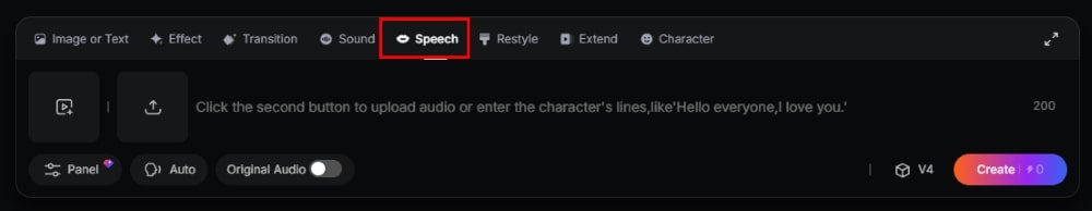 在 PixVerse AI 生成影片後,在影片下方點撃「Speech」,然後上傳音檔。如沒有音檔可以上傳,PixVerse AI 亦提供 5 個聲音樣本,只需輸入文字,選擇聲音,然後點撃「Create」,即可生成口型同步影片。