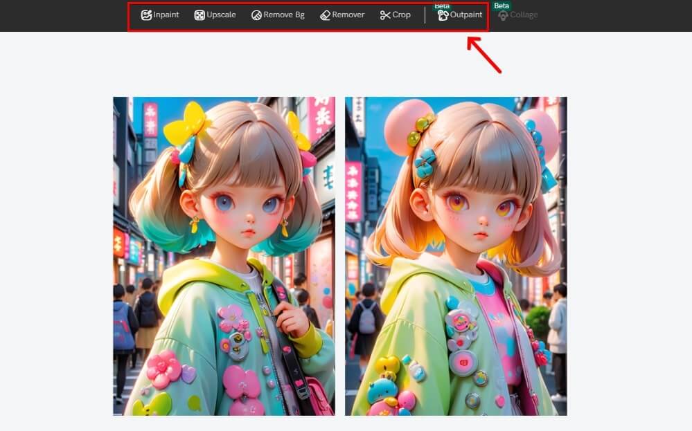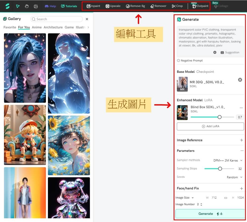 點撃生成後,Shakker AI 會生成兩張圖片。畫布上方編輯工具可以編輯圖片。