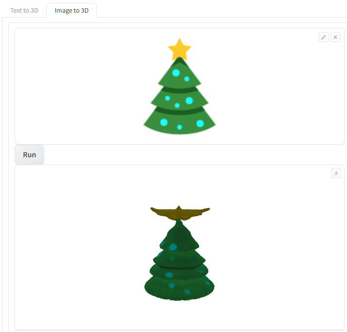 上載圖片或將圖片拖曳到方框,然後點撃 Run,即可自動生成 3D 模型,以下是我上載聖誕樹圖片,然後生成的 3D 模型。