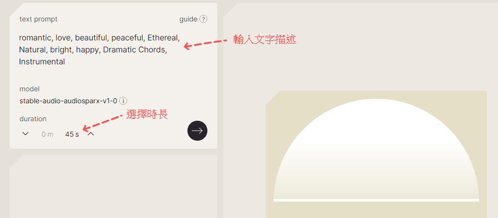 步驟二: 輸入文字描述,選擇時長,然後點撃 “黑色箭頭” 按鈕。