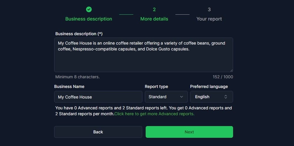 Venturu AI 會根據網站內容,自動提供描述等。點撃「Next」後再點撃「Generate」即可獲得報告。不過,Preferred Language 暫時未有中文選項。