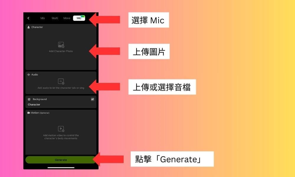 在「image」上傳圖片及「video」上傳希望生成的動作影片,Background 可選擇 White 或 Green,Finetune 使用On」 效果會更好。完成後,按「Enter」。