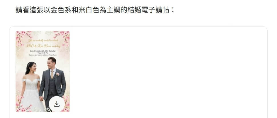 不會使用 Photoshop 等專業設計軟體,套用免費模板又顯得千篇一律,毫無新意。你只要把你的婚禮資訊整理好,AI 就能化身你的 24 小時專屬設計師,根據你的風格要求,生成多款精美的電子請帖。