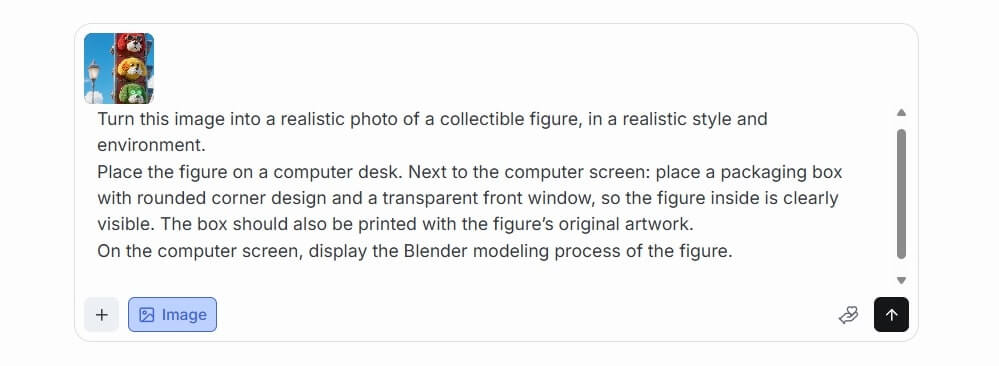 2. 在輸入框的左側,點擊「+」按鈕並上傳你想要模型化的圖片。接著,在輸入框中輸入你的提示詞 (Prompt)。