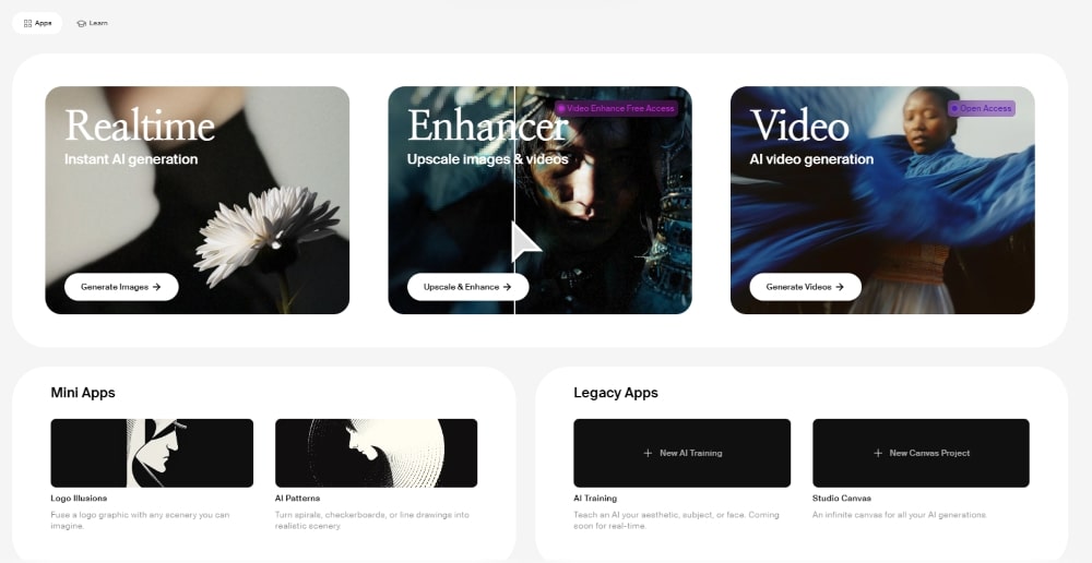 Krea AI 操作簡單,在首頁可選擇所需 AI 工具,即可開始。